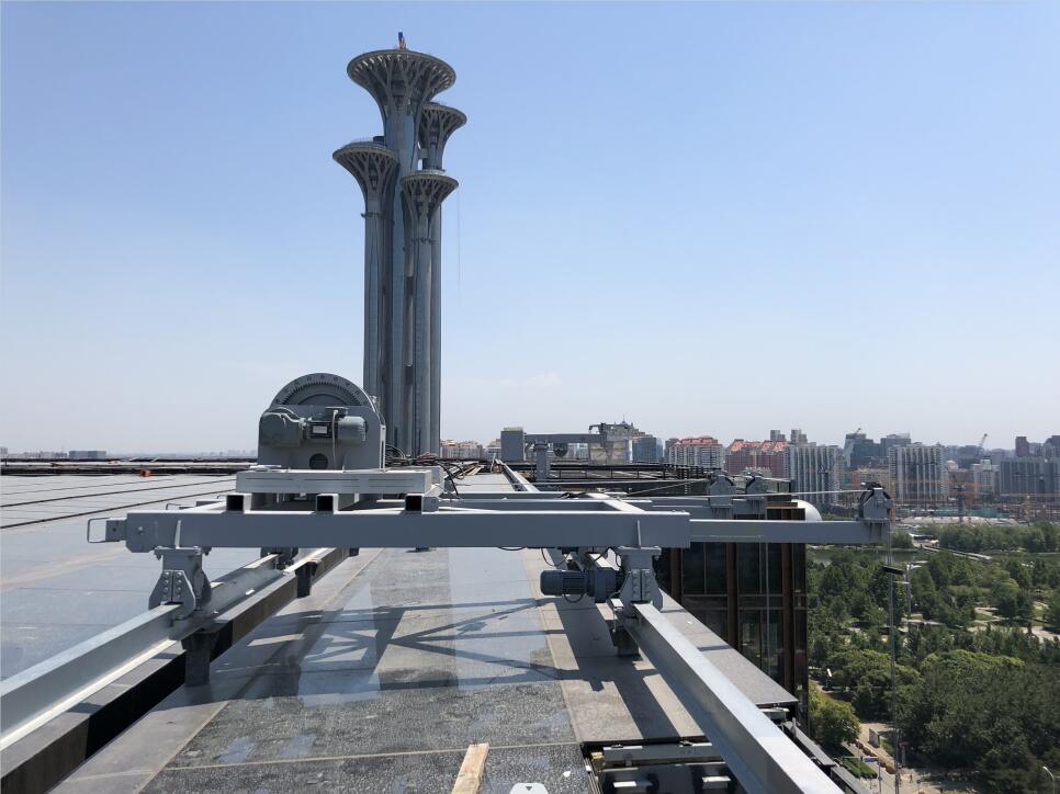 該項(xiàng)目所配備的屋面軌道式擦窗機(jī)工作高度460米,采用立柱升降式機(jī)構(gòu),擦窗機(jī)卷?yè)P(yáng)機(jī)構(gòu)為特殊定制。擦窗機(jī)在停機(jī)時(shí)可實(shí)現(xiàn)隱藏效果。